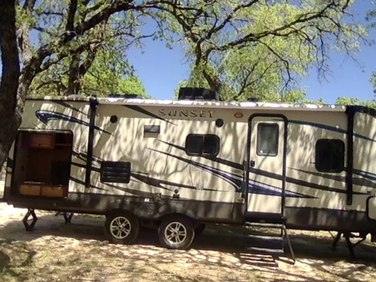Top of the line RV. Has a fireplace and Outdoor kitchen with sink and refrigerator (small portable grill). Corner Shower. Couch. Outdoor shower. It comes fully loaded with all you need except pillows and bedding. It has two portable outdoor tables, outdoor chairs, beach umbrella, DVDs, games, kitchen ware, Countertop ice maker. If you need a bigger grill you will have to bring. Small ice chest included.