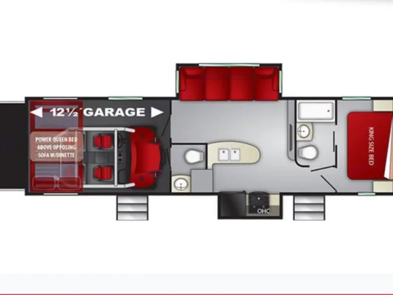 all of your big toys or extra storage with you on your trip! Garage length of 12.5' x 8.25' along with a 30 gallon gas tank with exterior gas nozzle to fill up you toys. Comes with an onboard 5500 Onan generator, dual AC units, 98 gallon fresh water tank and 230 gallon propane tanks.
