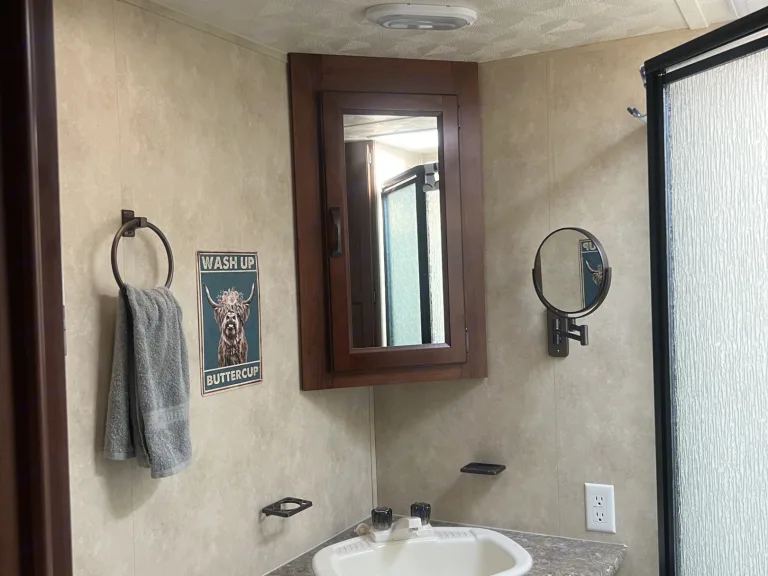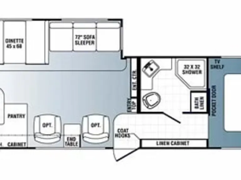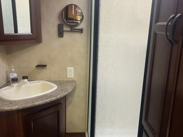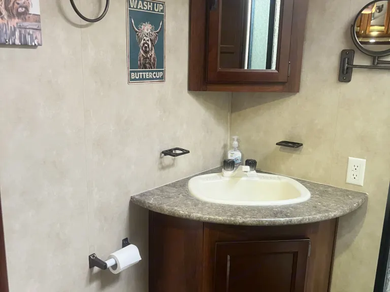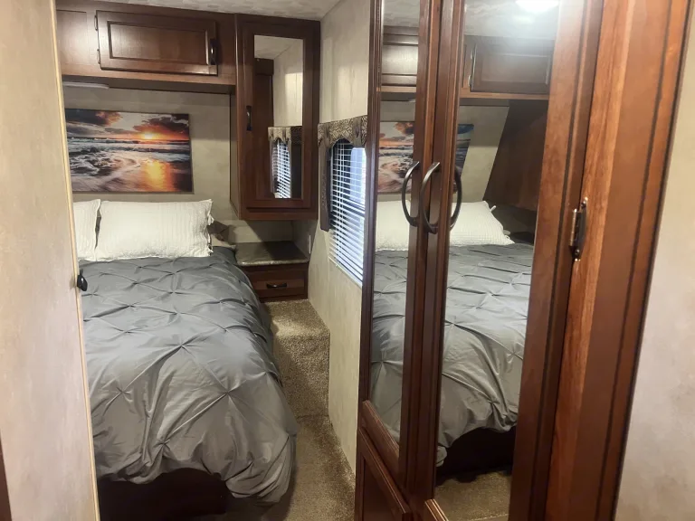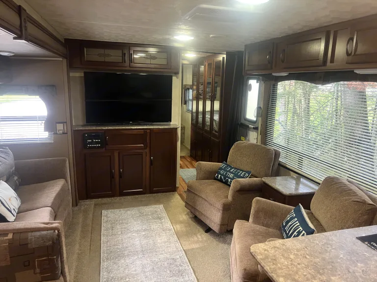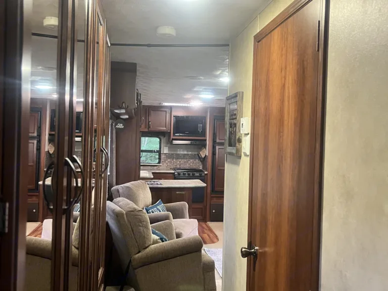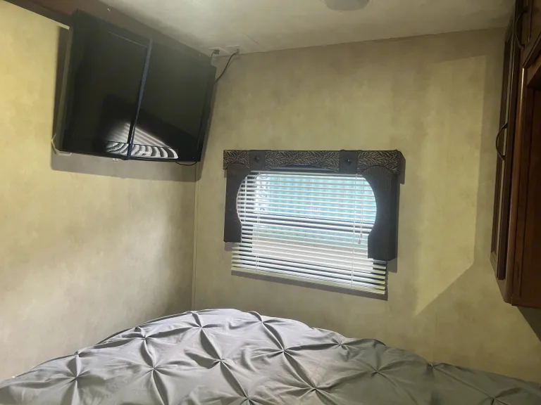 It has a private queen bedroom with cabinets for hanging clothes and upper cabinets. . Bathroom has corner shower, sink and toilet plus tons of cabinet space. Cabinets in the hall for hanging clothes. The living area has a 55" Roku TV, stereo, with outside speakers and CD/DVD player. Also in the living area are two rocker chairs and a pullout sofa bed.