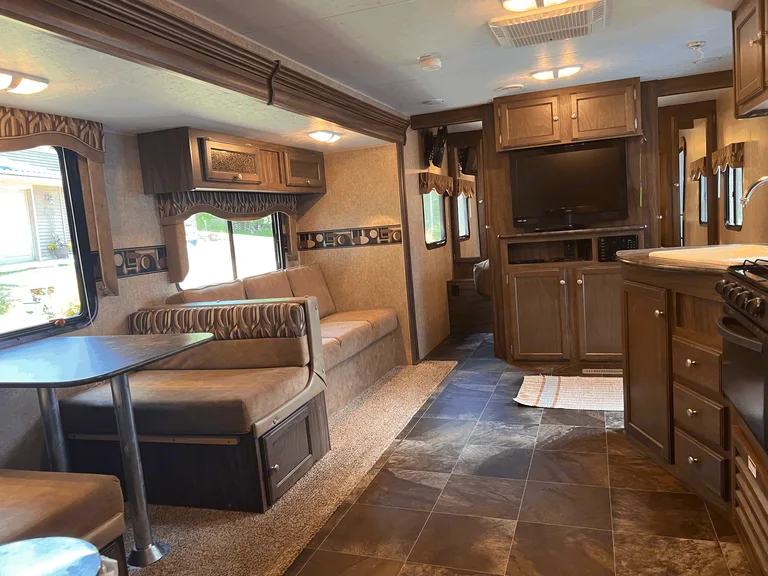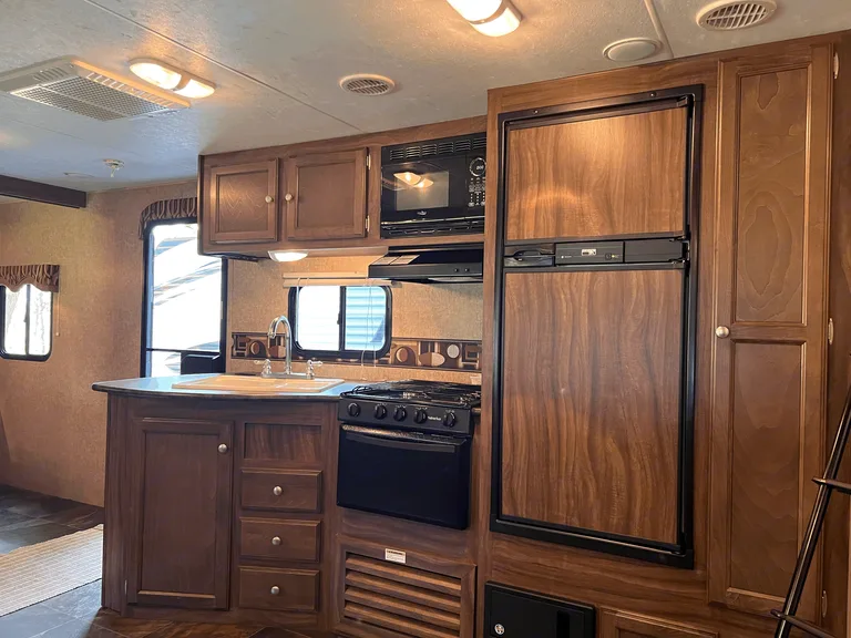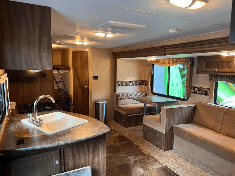 The kitchen area has a nice size sink, microwave, stove & oven. The faucet has filtered water. And it is supplied with various options for making coffee for those coffee lovers! As well as pots & pans, utensils and a few dishes. You can sit and enjoy your coffee at the bright dinette area which also converts to a bed.