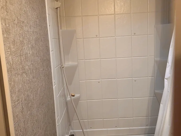 The bathroom has a standup shower, sink, toilet and exhaust fan.