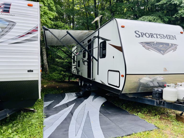 Outside there is an electric awning. Two very roomy storage areas and a large ground mat.