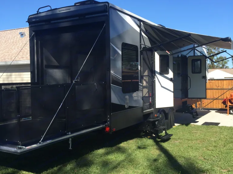 Toy hauler with a little class. It is fully self contained, including gasoline powered generator with a 30 gallon fueling staion. Has King size master bedroom and two Queen bunk beds. Sleeps 6, has 4 recliners and 3 tvs. It has 9' ceilings in the kitchen and living space. 2 awnings with on of them over the back deck.