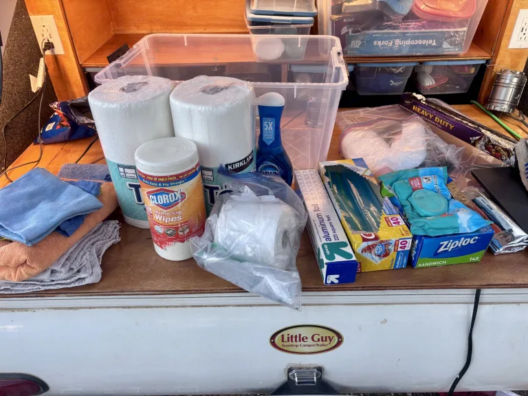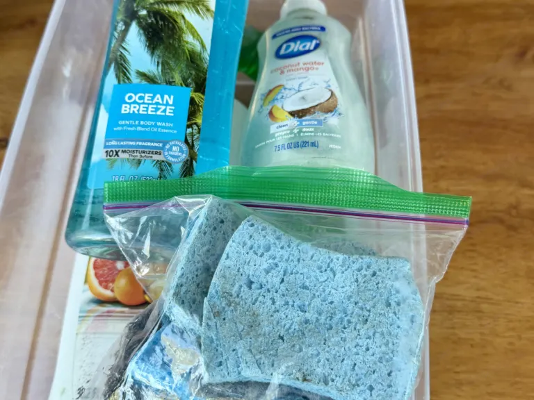 • Cleaning supplies (dish soap, Dawn dish spray, sponges, shampoo, conditioner, body wash, bleach wipes, rags)