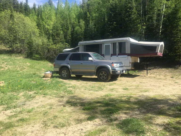 Immaculate pop-up trailer that sets up in under 10 minutes with in-unit bathroom, propane stove, fridge, and heater, plus other in-unit amenities including kitchen essentials, microwave, 12v battery, lighting, and radio. Sleeps six adults and bedding provided for two beds.