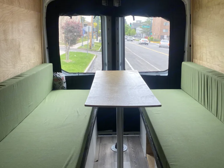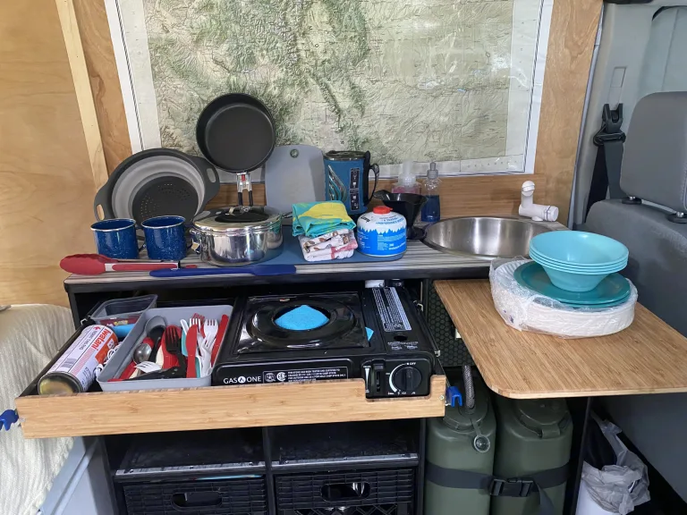 Whether you’re planning a weekend getaway, a cross-country road trip, or anything in between, this campervan has everything you need for a memorable experience. There is plenty of storage under the bench seats.The van is a home build and had everything you need, and nothing you don't! There is storage under the bench seats, which convert in to a comfy bed long enough for a 6'2" person to sleep. If you're under 5'3" you can stand inside this mid-roof model.The kitchen sink has a clean and grey water system (20 L capacity) which is easy to empty and fill. There is both a jet boil for quick coffee or food prep, as well as a propane fueled one-burner stove which can be used inside with ventilation, or moved outside. The passenger seat swivels for an extra seat to use inside.If you're planning a longer end of summer trip that starts between 8/17 to 8/21 and returns on or after Labor Day I'll share a code for 10% off.Thanks for viewing!What's included• Full size bed converted from the bench seats and table. Has a memory foam mattress topper and plenty of blankets and pillows