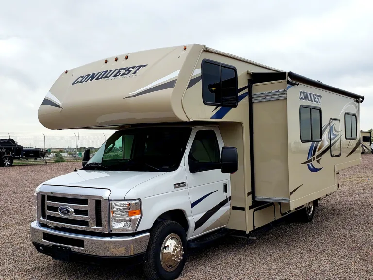 Our Gulf Stream Conquest 6245 has a full-wall slide that gives the RV much more room than a traditional 24′ Class C. It also comes equipped with solar panels to help keep those batteries charged in situations where you don’t have hookups. It has a walk-around queen fold-up bed instead of the more traditional corner bed. With all our upgrades, including a TV upfront with soundbar, it has the luxury you need and is large enough to accommodate up to six.