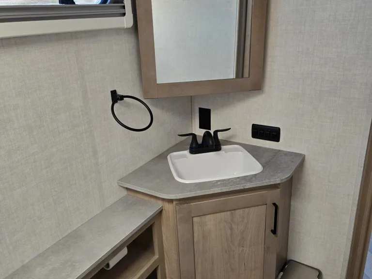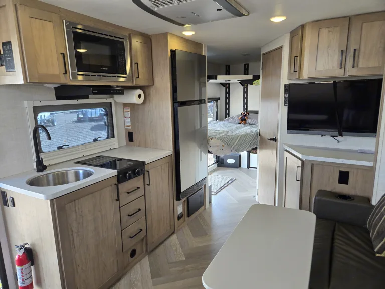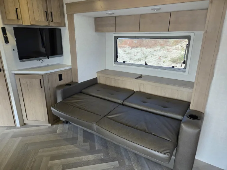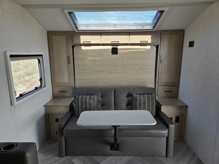 A seamless blend of versatility and style, the 221MSL has it all. The storage locker is a massive 74" X 46" and comes fitted with the Embertrack system so you can use the benches as bunks, a desk or remove them altogether. The rest of the rig features a 60"x 80" walk-around queen bed, a comfy sofa with removable table and a fully stocked kitchen.