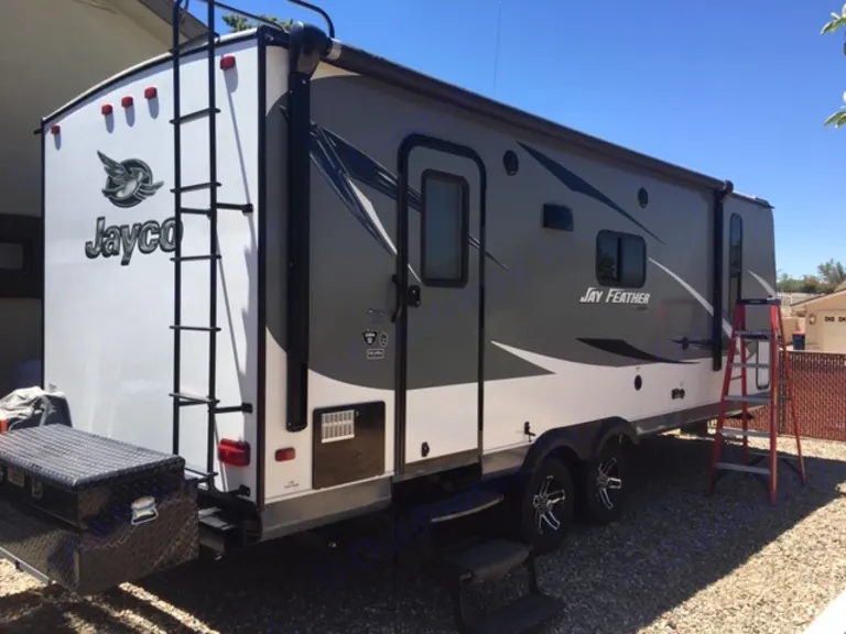 2016 Jayco Jay Feather, 24 foot. Has a Murphy bed that goes up and gives you a lot of room to sit on the couch, watch TV or whatever. Can be self contained, as there is a generator and great for boondocking. Full size queen bed has foam topper, very nice, can sleep two adults and two children when dining room is converted to a bed.
