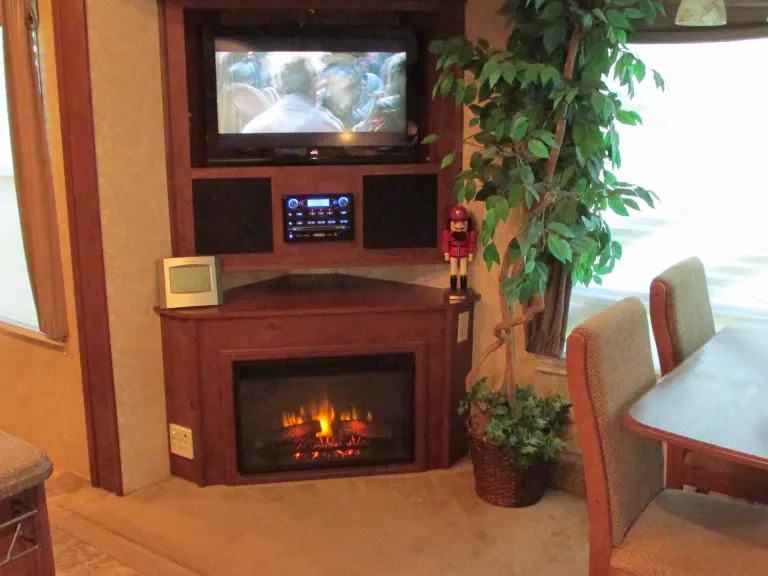 Triple slides, dual ac's, power awning, power stabilizer, power jack power roof vents with rear lounge and fireplace.