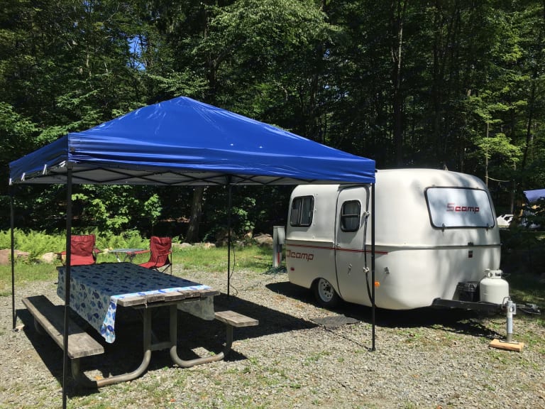 This trailer is available for delivery throughout the Pocono Mountain area. You make your campground reservation. We will meet you at your campsite with the Scamp and set it up for you.