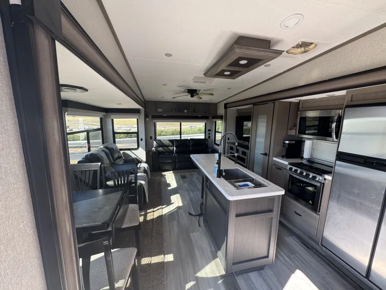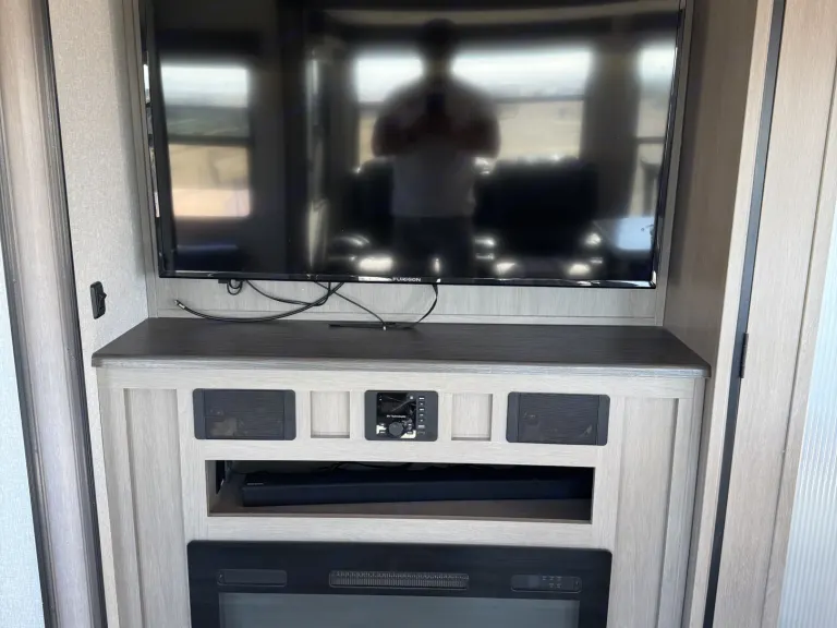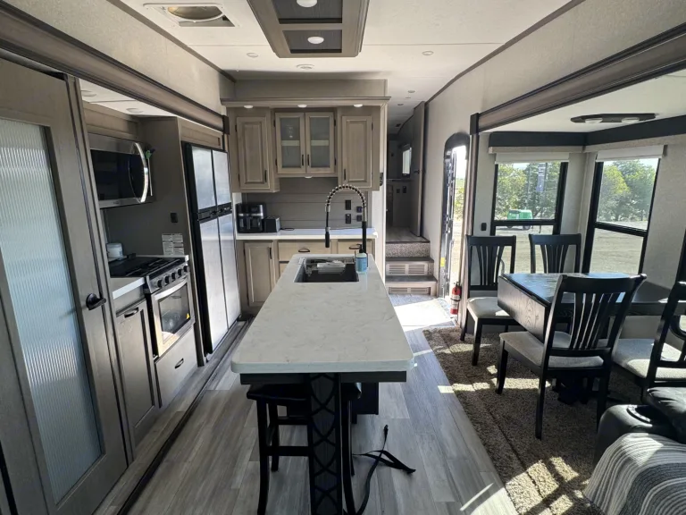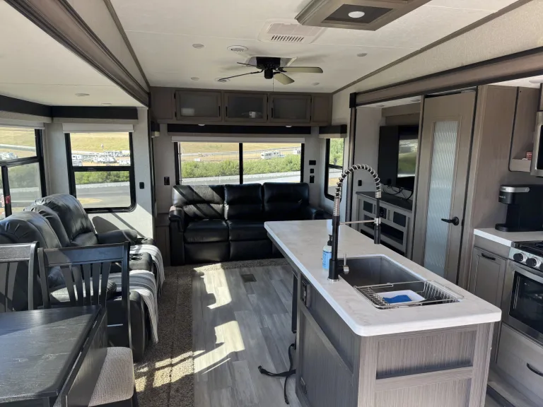 36’ Coachmen Fifth Wheel with all the amenities. Features a full kitchen island and separate pantry for all your food and snacks. Double door kitchen refrigerator and freezer. Full King size bed with double door sliding closet in the 1st upper tip out. 2 large tip outs in the main living area leaving plenty of room to relax. Also in the living area is a large black leather sofa that folds out into a Queen size bed in less than a minute. Flat screen tv available with an attached Roku to use with a wifi hotspot (not included). Unit has 2 separate AC’s and 2 forms of heating, 1 electric fireplace and 1 heating unit using propane. Large exterior awning allows for plenty of relaxing along with LED exterior lighting to accent your evenings outside.*Gooseneck hitch connection only, no regular 5th wheel hitch required*Please excuse the photos with all the belongings inside. Photos were taken on a trip and do not represent how it will be delivered.What's included• (2) camping style chairs.
