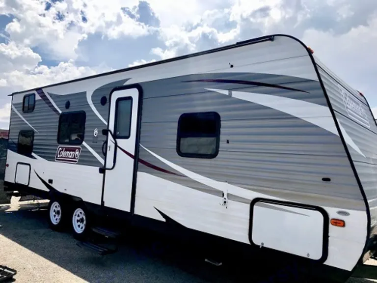 Coleman CTS274BH Travel trailer Rental. 27 foot box 29 feet in length, Sleeps 7-8, Front bedroom with queen bed, couch and dinette, Double bed with bunk bed, Dual kitchen sinks. Bathroom sink, 6 gallon water heater, 60 gallon fresh water tank, 42 gallon black water tank, 42 gray water tank, 2 batteries, 2 propane tanks, 3 way fridge, 3 burner stove with oven, Microwave, AC, and Auto ignite furnace. Spare tire, Awning, Storage, Dry weight 4630 lbs, 100 Watt Solar Panel, and more. Tax and damage waiver is not included in rates. To run outlets, microwave, and AC city power or generator is needed. Half ton towable with trailer brakes and 2 5/16 ball EQ hitch. (High Season is between Memorial to Labor Day weekend.)