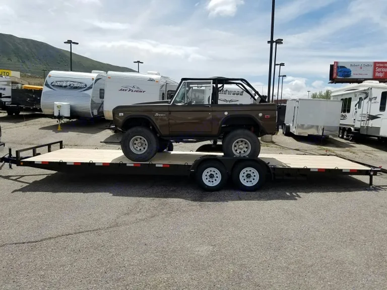 26FT Flatbed Trailer Rental - Bed length is 26ft with a 3ft tongue bringing the total length to 29ft and weighs 2900 pounds. Has 17 heavy duty half rings welded throughout the bed for easy tie down. Can handle up to a 7k load and has 5ft hideaway ramps with rear adjustable stabilizing jacks. All four wheels have electric brakes for your safety. Can haul two 4 seat side by sides, equipment, vehicles, and much more with this fantastic flatbed.