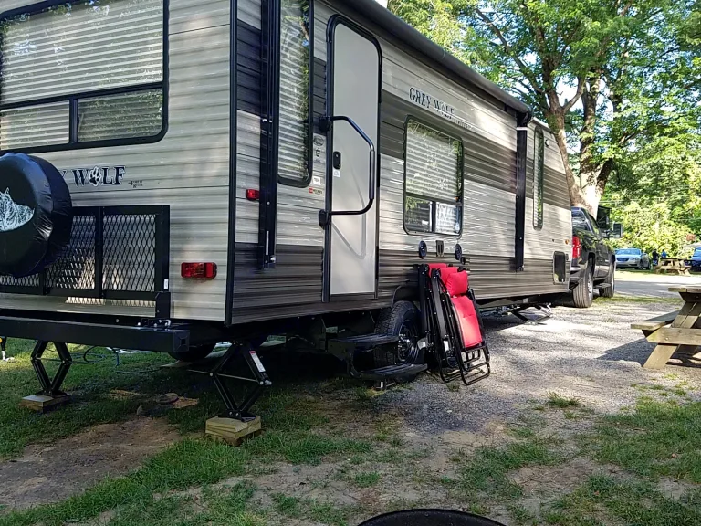 2017 Forest River Grey Wolf 25RL is the perfect unit for a young couple or empty nesters looking to enjoy a quiet, relaxing time away from home. It's small, yet cozy, with a large picture window in the rear of the camper over the sofa. This is great if camping somewhere with a great view that you can back the camper up to. This travel trailer can sleep up to 6, though it would be very crowded. The camper is most comfortable with 2 adults, though a 3rd adult or a couple of children would also be comfortable in this camper. Anything more than that becomes crowded. It has a queen sized bed with an upgraded memory foam mattress and pillow top cover, a jack-knife sofa, and a dinette that turns into a sleeper. It has a spacious bathroom with a shower and large linen closet. Both the living room and bedroom are equipped with flat screen TVs. There is a built in DVD player with surround sound, that also works as a radio or CD player. There are external speakers as well.This is a light weight camper making it towable with a half ton truck, V6 truck. Though we do require that the towing vehicle has a minimum towing capacity of 7600, so be sure to check this before reserving. The vehicle is also equipped with a rearview camera (use of the monitor is included in the deposit) and a fold down cargo rack with a 200 lb capacity.Included with rental: