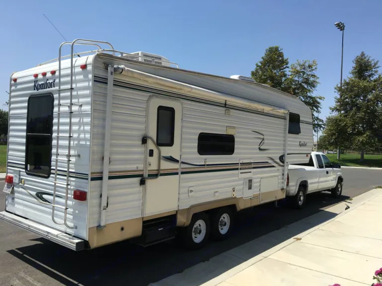 Nice size fifth wheel, great for a couple or small family, spacious living area and kitchen, prefect size dining table, big shower, full size queen bed, flat screen TVs lots of windows for light with day/night shades so you can have privacy and have light or block out all the light