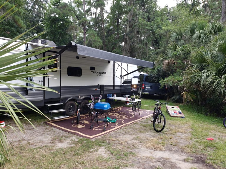 Big camper for big fun. Chairs, table, firewood, roasting sticks included. Inside and outside speakers. Electric awning and slide. Shower, hot water, stove, and microwave.Approximately 2 hours from Savannah, Atlanta, or Valdosta. What's includedWe keep fresh linens, pillows, towels/rags, basic cookware, utensils, toiletries, and plasticware in the camper. RecommendationsSome of our favorite campsites are Okmulgee State Park in Mcrae, Pine Mountain Resort in Pine Mountain Ga, and any atv park we can find to play in some mud.