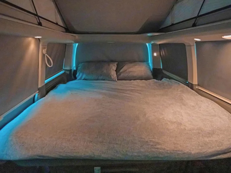 Experience a cozy RV rental bedroom. This inviting space features a comfortable bed with ambient blue LED lighting and neutral tones.. Volkswagen California Beach Camper 2024