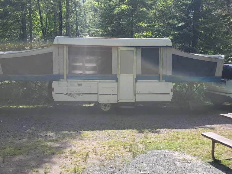 Beautiful remodeled popup camper. Two queen pull outs with privacy curtains and 2 seating areas that can turn into extra beds!