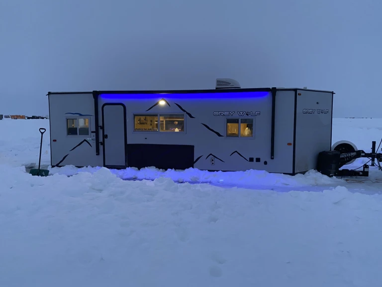 All season 2020 Grey Wolf ice house RV with hydraulic raise/lower so it is very easy to set up. Dinette folds down into queen size bed with a queen size bunk above it with push button to raise/lower. 8-holes will fish 4 people comfortably. The insulated floor along with the electric fireplace and 40K btu furnace will keep you very comfortable. Sink drains grey water outside the trailer (use water jugs in the winter), 3-burner stovetop with oven and full size RV fridge/freezer for your food storage and cooking needs. Water is shut off for the winter for the sink and the shower, but we use RV anti-freeze for flushing so the toilet works. This is great so you don't have to use the nasty Biffy's on the lake!! (**Black water tank must be emptied prior to return to avoid a $100 dumping fee**). Jackknife bunk folds into a bed with a single bunk above. 8 Catch Cover brand rattle reels and rod holders. 2-30# propane tanks full at pickup. Additional propane is renters responsibility.