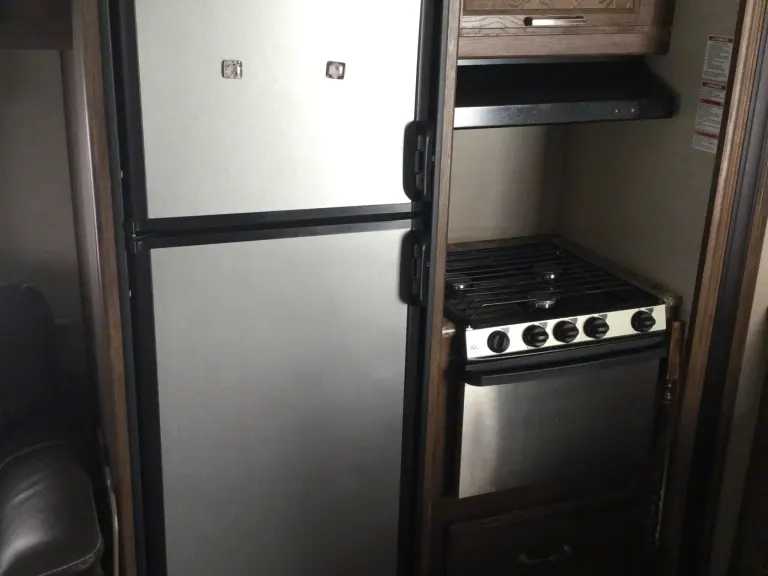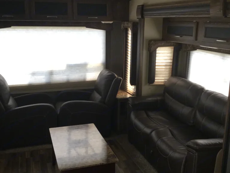 Two recliners, couch / bed, entertainment center has am/fm/cd stereo , 32 in flat screen tv and a fireplace, full kitchen with microwave, bathroom with toilet/shower/vanity, residential queen size