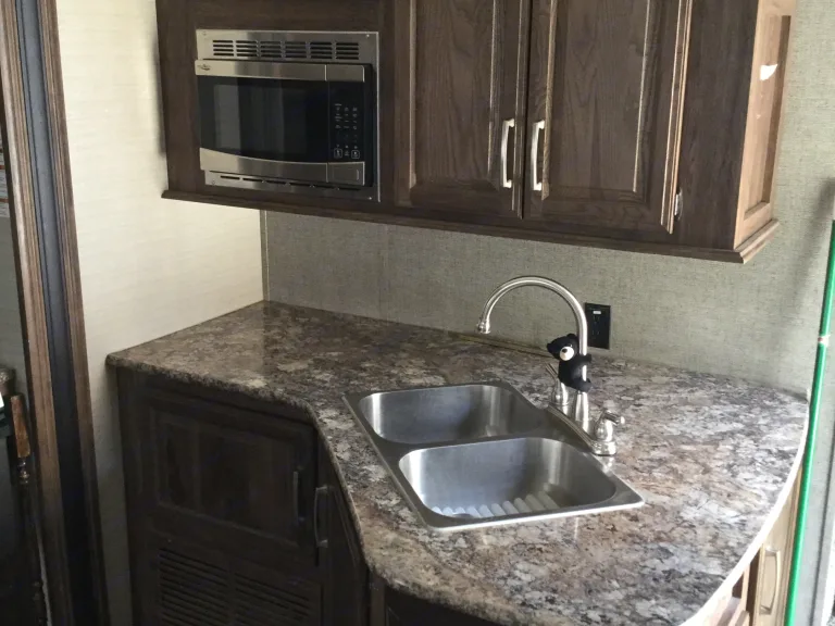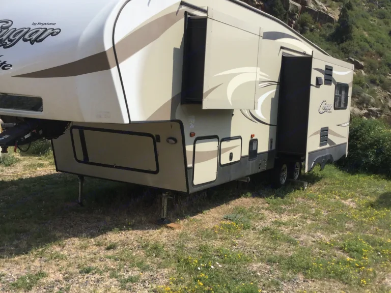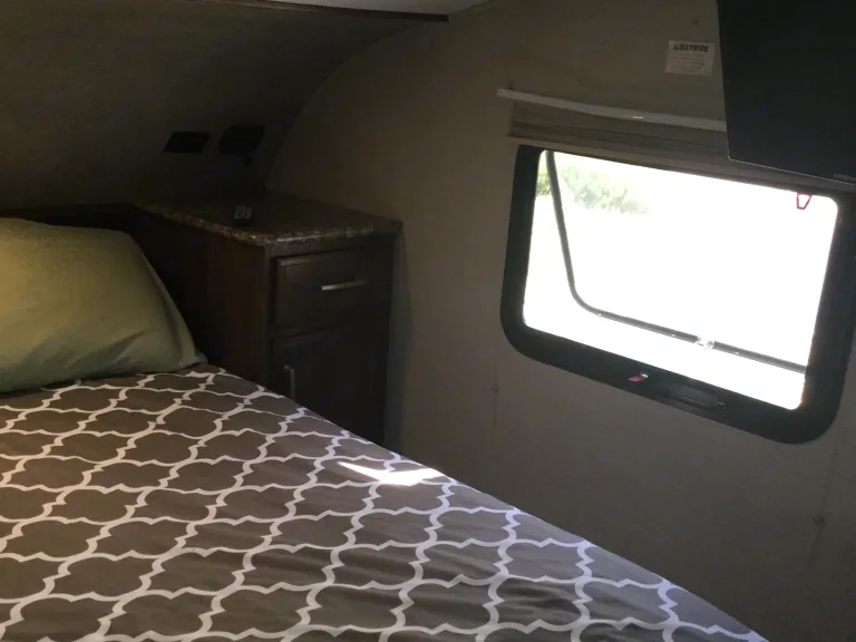 Bed and large wardrobe,and flat screen tv. Outside are electric powered jacks front and rear with self leveling feature, 120 v outlet, large basement storage area, easy hookup and easy tow.
