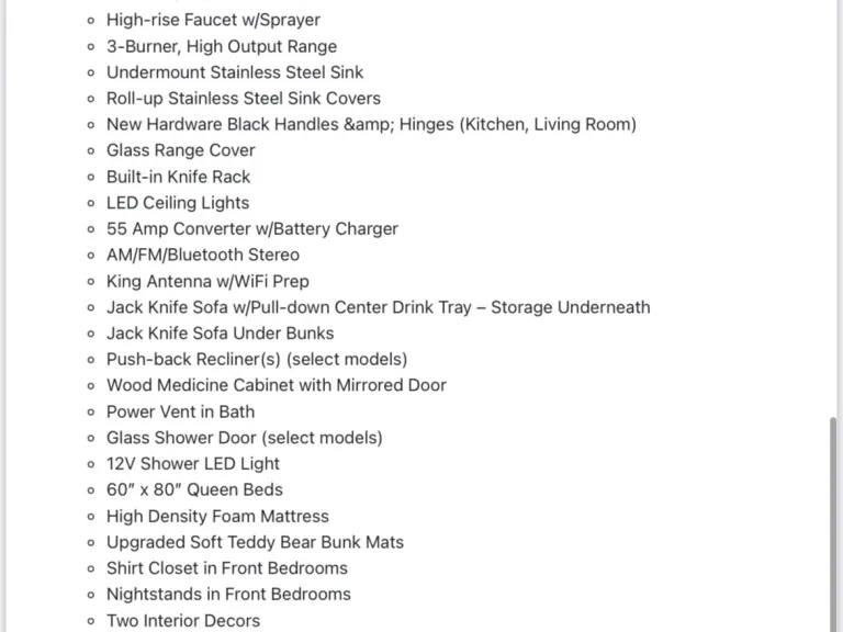 Experience the ultimate in luxury camping with this Limited Edition, 4-Seasons travel trailer! Designed for comfort and convenience, this spacious 2-bedroom camper features queen beds at both the front and rear, ensuring restful sleep for the whole family.Built for all seasons, it boasts residential insulation throughout, an enclosed underbelly, and a fire-burning stove and oven—perfect for cozy nights in. The oversized fridge and walk-in pantry provide ample space for all your culinary essentials, while the large U-shaped dinette and sofa in the slide-out offer extra room for seating and sleeping.Stay cool year-round with two A/C units—one in the primary bedroom and another in the living space. A mounted TV above a gorgeous electric fireplace adds a touch of elegance to your relaxation zone.Love cooking outdoors? You'll appreciate the mini camp kitchen, featuring a griddle, fridge, and sink—ideal for whipping up meals outside. Two separate entry doors allow easy access to both the kitchen and bathroom. Plus, an outdoor shower makes it effortless to rinse off sandy feet or muddy paws before heading inside.This well-equipped RV rental comes with everything you need for a comfortable stay—just bring yourself and your sense of adventure.Inside, you'll find fresh linens, cozy bedding, plush towels, and essential toiletries, so you can travel light. The kitchen is stocked with all the necessities, including cookware, dishes, and utensils, making meal prep a breeze. Whether you're exploring or unwinding, this RV is ready for your perfect getaway!What's included• We stock towels, toiletries, camping emergency needs (bug spray, sunscreen, aloe), emergency kits, loofas, pots and pans, smoothie blender, coffee maker, water steamer, cups, plates, utensils, cookware, basic seasonings, paper towels, food storage, trash bags, extra linens and blanks and beach towels, kids and adult games, activities for kids, camping chairs and table, extra 10x10 manual awning.Other things to noteMy husband is very particular about our trailer so we will only rent as a delivery (by us) and pick-up (by us) option. Please feel free to message me with any questions!