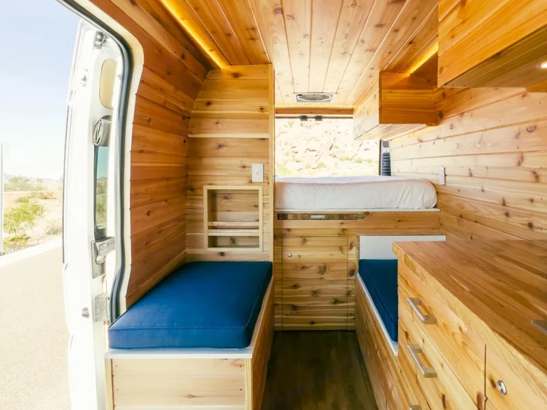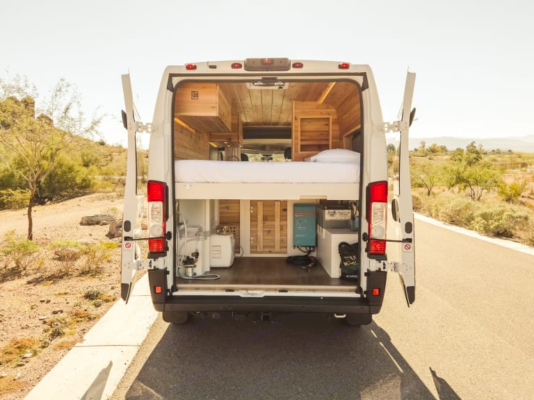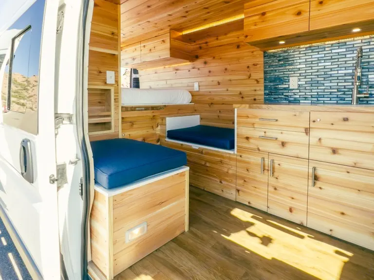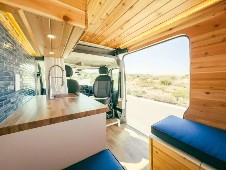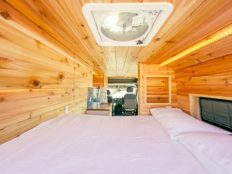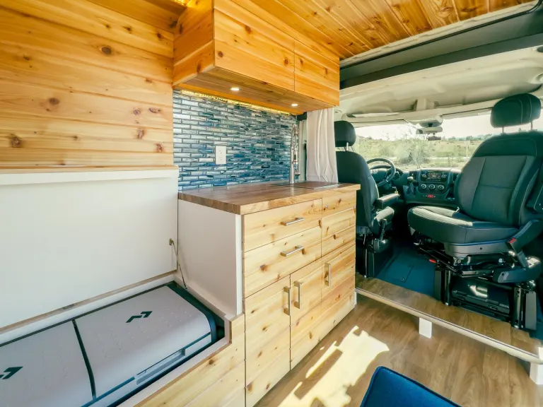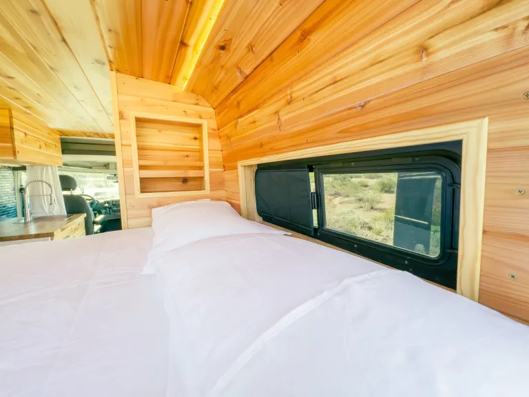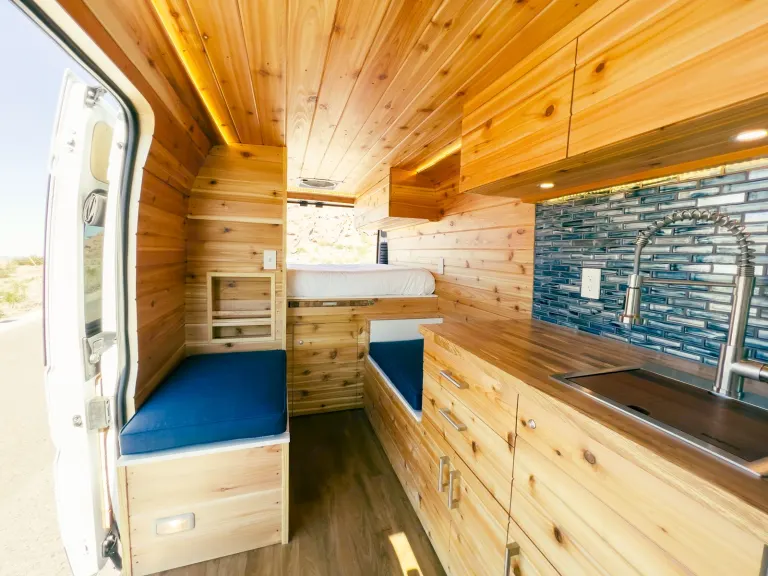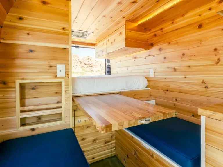 Delilah THE Boho VAN -- AS Seen ON Shark TankDelilah is your mini-retreat for wherever you choose to wander! Cruise in comfort and style. Her cedar-wrapped interior will make you feel like you're staying in a cozy off-grid cabin.Delilah is fully equipped with a mini kitchen, an outdoor shower, and a dining nook with a slide-out table for face-to-face dining.Note that both passengers ride up front! That means everyone has a great view while on the move, but it also means that Delilah can only accommodate adult passengers (or big kids). Small children should not ride in this van.Stow your gear in the spacious storage area under the platform bed. You'll be thankful to sink into the memory foam platform bed after a long day of adventuring.A house battery bank runs all her systems through the power of roof-mounted solar panels, a DC-DC charging system that powers her batteries on the move, and a shore power hookup to give the batteries a full charge when needed. This off-grid power runs her systems inside the van including a dual-zone fridge, 12V roof fan, a water pump to pressurize 25 gallons of fresh water to the indoor sink and outdoor shower, interior LED lighting, and outlets to run your favorite gadgets.Delilah’s owners, Long and Nam, designed every detail within. All the finishes are completely custom – throw blankets, pillows, tile, cabinet pulls, upholstery, and even the flooring – it’s all unique and hand-picked by us.This is a great "Try Before You Buy" van as Delilah was thoughtfully designed and created by the talented team at Boho Vans in Arizona.Note: For the safety of our guests and Delilah, and for insurance purposes, the van does have a diagnosis and GPS system installed.