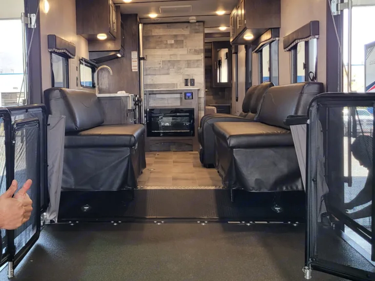 Our "Rig" is a toy hauler with an easy to convert ramp to gated patio. (for small children and fur babies). It includes a mosquito drop down screen.
