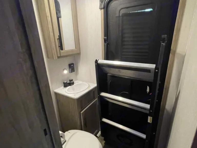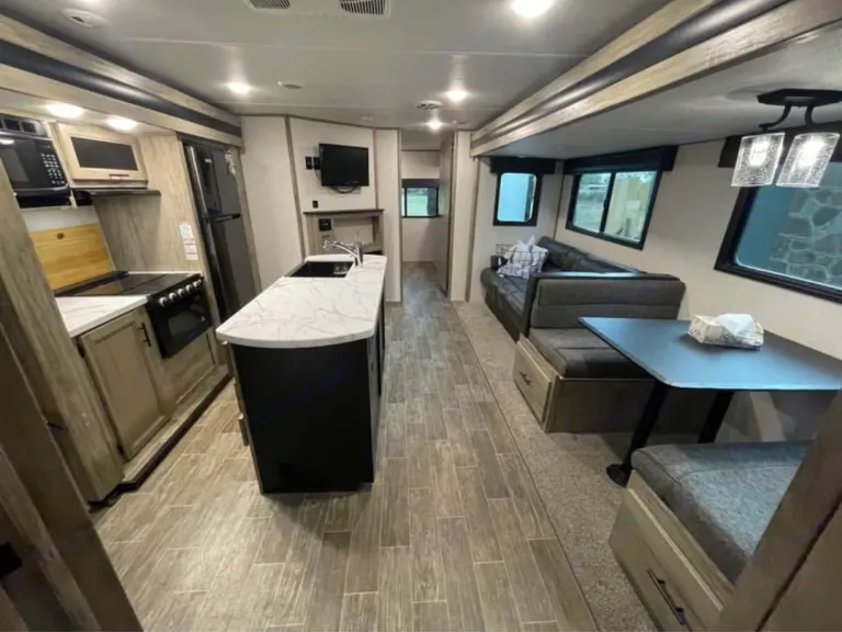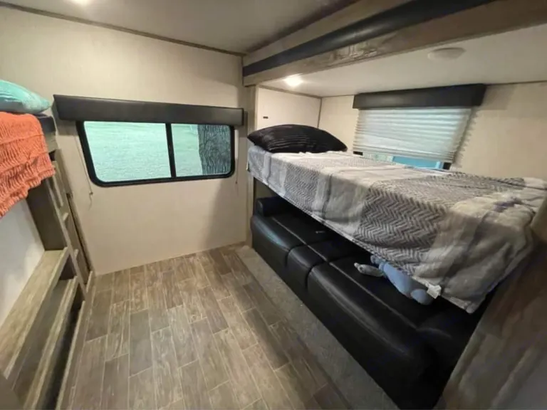 2-Night Minimum. This 2021 Alpha Wolf Travel Trailer (50-Amp*) has plenty of space for family and friends! It comes equipped with a queen size bed with memory foam mattress, as well as a convertible booth and two jack-knife sofas, and a bunk room for the kids with twin bunks (and a door that closes, so Mom and Dad can still enjoy the rest of the space after the kiddos go to bed!)In addition to the main bath with a corner shower, there is a half-bath in the bunk room for added convenience.We offer full delivery with set-up and takedown and are happy to help with any questions you may have. We want your stay to be as fun and comfortable as possible, full of great memories.Included in trailer:-TV w/ Roku and Bluetooth Stereo for indoor/outdoor entertainment.