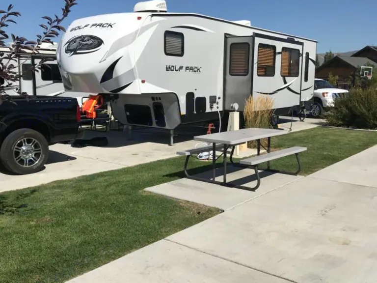 Well maintained 40' Toy Hauler 5th Wheel with Anderson Hitch conversion setup.I prefer to tow and set up but will allow individuals whom can tow with confidence and knowledge. You will need only the goose-neck ball installed on your truck or I can deliver and setup. Best suited for a campground with 50 amp service, sewer and water hook ups.Available to haul toys in, however will need my approval for weight, and proof of registration and insurance to tow in my trailer.Adequate space for 8 to sleep in. No inside cooking allowed without approval (meal prep only). 3 TV's, use your amazon fire anywhere you have internet service. All sewer, water and electrical connections etc included. 2 AC units, reclining couches in case its too hot outside. Has tow camera easily used in any vehicle towing it.Will walk through the entire process of towing, setup, etc. will even provide a step by step manual to take with you, anyone can tow and park this.Pet friendly dependent on breed/size of dog. No cats, no animals on furniture. Non-refundable pet deposit cleaning fee and refundable pet damage deposit.If campground you are staying at does not provide a dump station, there will be a fee of $75 for me to dump and clean.