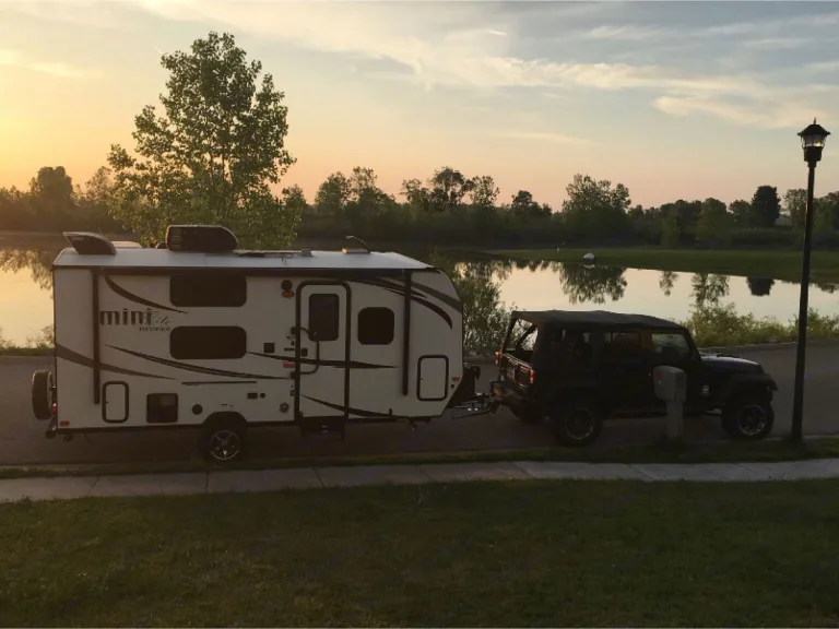 Pulls like a dream. Weighs 3k lbs and it pulls like a dream without the need truck. Been used less than a dozen times.Sleeps 4 and has a lot of living space because of the Murphy bed. Has a mid-size fridge, stove, oven, microwave, full bathroom (w/ tube), AC unit, furnace, a heated queen size bed, built in DVD player with interior/ exterior speakers, exterior shower and a 13’ power awning w/ LED scare lights.What's included32” TV, grill that mounts to outside, 25’ outdoor RV Rug, 2 zero gravity chairs