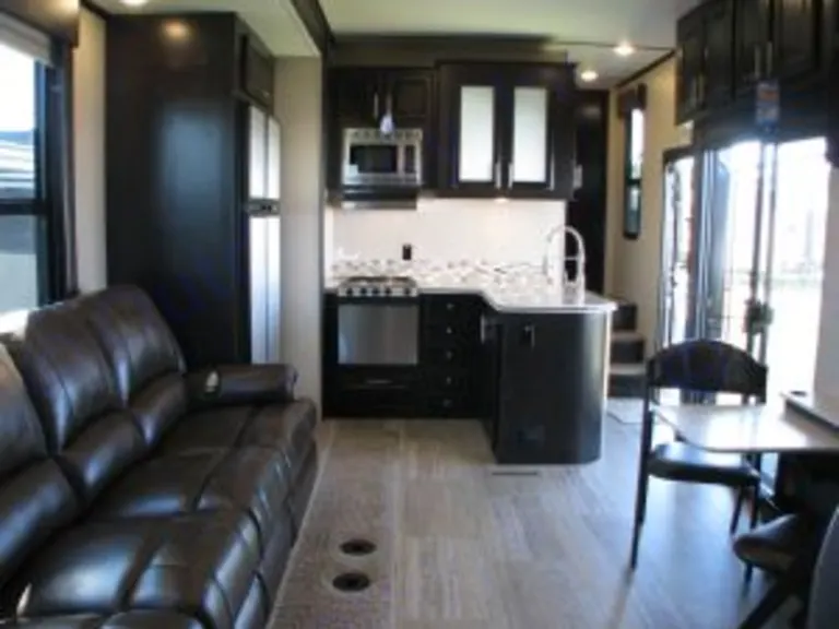 Enter the main living area and find a slide which helps to open up this space. The slide has a sofa with folding backrests, pantry, and refrigerator. Adjacent to the slide you will find a three burner range, microwave, overhead cabinet, and L-shaped counter with a double kitchen sink. To the left of the main entry door there is a patio deck which allows you to enjoy the outdoors, but yet be up off the ground. In the corner of the living area you will find an entertainment center with a 50" TV.