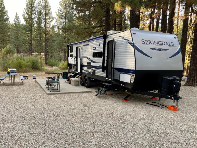 We absolutely love our Springdale 280 bunkhouse and can't say enough great things about it! We take great pride in the quality of our trailer and hope to offer you everything needed to have a wonderful experience yourself. We offer a complete walk through before you hit the road to help make your set up and pack up as seamless and comfortable as possible.You will find premium features to make your camping experience feel more like a home away from home. Some of these features include a larger than most refrigerator, onboard games, bluetooth stereo with interior and exterior speakers, Roku TV, mood lighting, outdoor kitchen area, and two separate entry doors. very spacious and you'll have plenty of room for relaxing, cooking, playing games, or talking late into the night. Don't be afraid to bring along as much as you want either because there is a walk-in pantry, overhead cabinets, and dual closets in the private bedroom for storing your travel items.Inside is also very spacious with a queen bed in the front master bedroom, double size bunk beds in the rear, a sofa sleeper, and a booth kitchen dinette that folds down. We are a family of 7 and sleep comfortably in it, but the specs say it technically sleeps 9. There are also blackout shades in the master bedroom and bunks to help keep light out if waking up as the sun rises isn’t your thing.