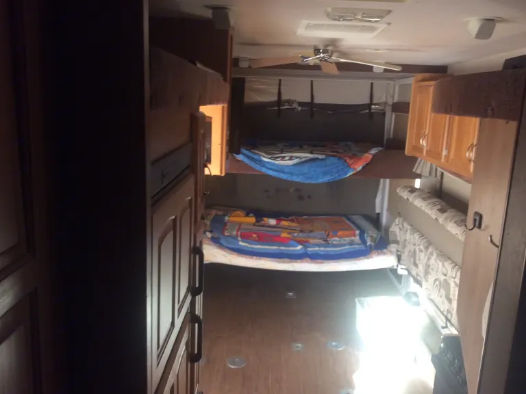 a full bed room shower microwave stove two beds in back this is a toy hauler freezer refrigerator