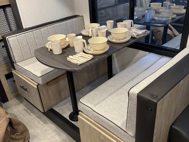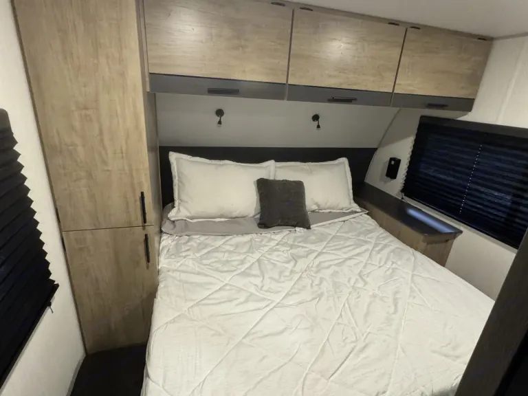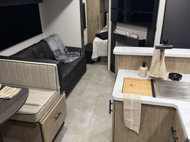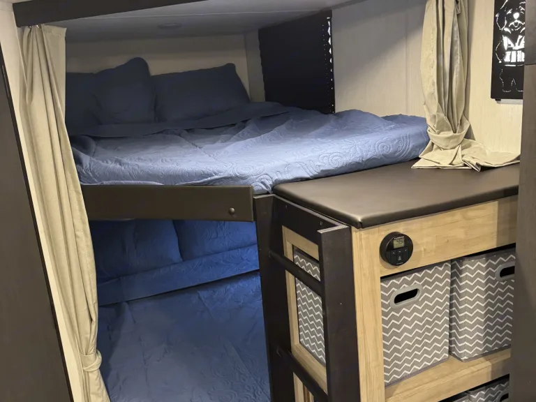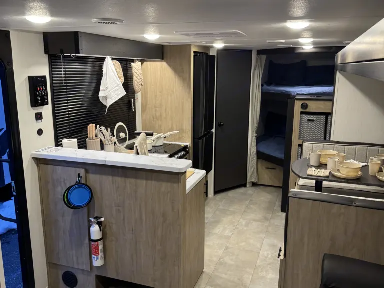 Try our brand new 2026 Forest River Campsite Reserve 26CJ. This open floorplan bunkhouse can have nine sleepers (8 adults and 1 child). You’ll have everything you need to make your this camping trip dreamy and comfortable. Enjoy the nature around you when you look through its big privacy glass windows, including a massive square window in the kitchen while keeping your privacy. hidden pantry; microwave/air fryer; built-in electric fireplace to enjoy on rainy cool days; tankless water heater; Bluetooth AC with dehumidifier; NextGen stabilizer jacks; outdoor shower, outdoor kitchen and fabulous awning to shield you from the sun, a separate entrance to the bathroom to clean up before entering the main area, if needed.