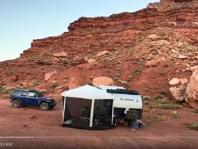 You and a friend, spouse, or partner will enjoy exploring nature with this cozy Clipper Camping Trailer in tow. The rear entry door provides access to a queen-size bed for two people, plus a countertop and bench seat and sinks for washing up. The pull-out camp kitchen with griddle makes cooking simple, and the 12 volt cooler and interior fridge will keep your perishables fresh while traveling. There is even a 20K furnace if the nighttime gets too cool. With the off-road package standard you will appreciate the flipped axle and 15" off-road tires for when you want to head off the beaten path for a while, and the off-grid solar package will help you with power. It's been upgraded to two batteries and two propane tanks for longer off-grid trips. It includes an indoor shower, toilet (cartridge tank), and outdoor shower. It also has a microwave and a roof top air conditioner, but they only function when connected to a power supply.What's included• Basic cleaning supplies, cookware, 25' drainage hoses, rechargeable fans, and a shop vac to keep it tidy.RecommendationsWe loved taking it out west to MOAB, Monument Valley, and Zions. But it's great for camping trips right her in the midwest. Camper for mom and dad, tents for the kids! That's how we roll and it works great! We do have tents, Canopies for rent as well if looking for all equipment needs for a larger group.