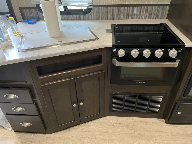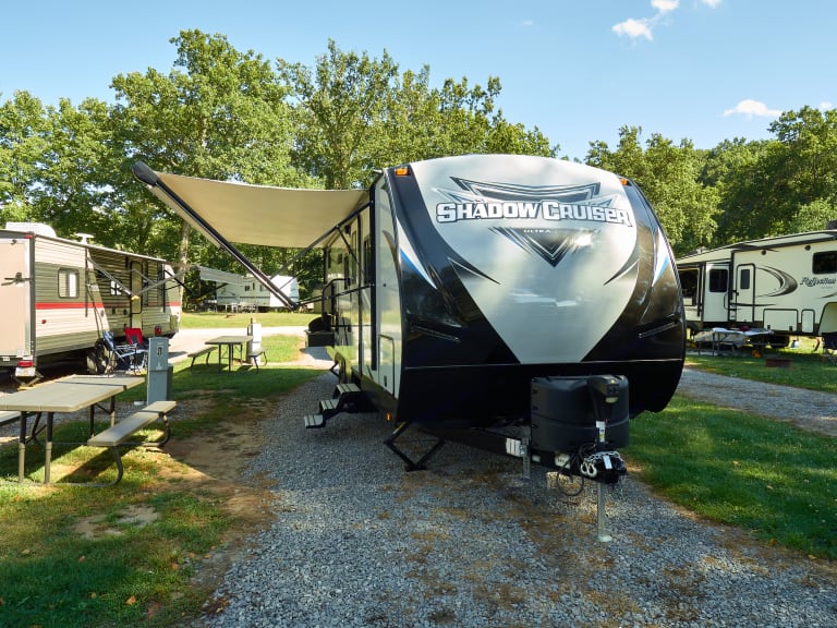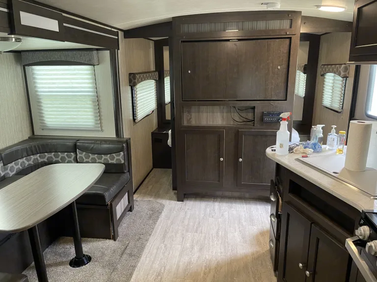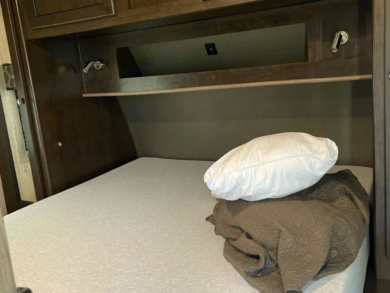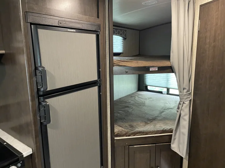 Spacious and Family Friendly Bunkhouse!!! Two Full size bunk beds, Queen Bedroom, and a convertible dinette to fit the whole family! U-shaped Dinnette to feed the whole family! Watch TV in the living area or the bedroom on those rainy days with a reversible TV and entertainment center. Outdoor Kitchen is equipped with sink, stove and fridge. Delivery available for a fee. Delivery is subject to availability, please message with dates and times to confirm delivery. Pets welcome with small additional fee. What's includedKitchen utensils, pots/pans.