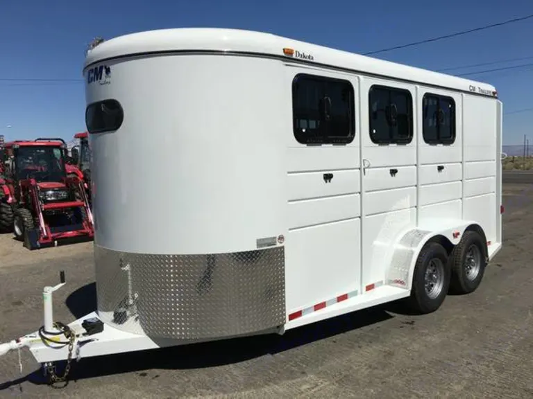 Slant Load Bumperpull Horse Trailer, Dakota by CM Trailers CMH0543-1770The Dakota is a steel slant load bumper pull horse trailer with a 30″ tongue and is 7′ tall. The Dakota has rubber torsion axles with four-wheel independent suspension & greasable hubs. Forward self-adjusting electric brakes on one axle are standard on this model. This model has radial tires on silver modular wheels with chrome center caps and a spare tire rack in the tack area.The Dakota is equipped with 2″ Bulldog coupler & safety chains with hooks. It also features an emergency breakaway system: switch, cable & battery box complete with battery and a 7K top-wind jack with caster wheel. The Dakota is fitted with one dome light in the stall area and one dome light in the tack area, along with DOT required lighting.