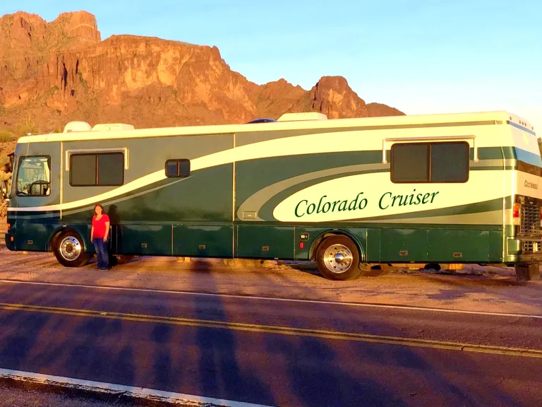 Explore Colorado and beyond in the comforts of our 40ft "Colorado Cruiser". With one large single slide out creating a spacious living room and kitchen area. It is powered by a 370 hp turbo diesel CAT engine and 6 spd automatic transmission. In other words, plenty of power, easy to drive.The kitchen comes complete with a new microwave/convection oven, two burner propane stove, new refrigerator, double sink and Corian counter-tops plus lots of solid oak cabinet space. One A/C unit in the front and one in the back master bedroom will keep you cool day or night.The living room has a brand new Tri-fold couch (sleeps 2), easy chair and 36" screen Hdtv. The master bedroom has a queen size bed, TV and plenty of closet space and drawers for storage. Start your day with a hot shower in a very roomy bathroom, comfortable shower for even those over six feet tall and with bed and bath linens.The Cruiser comes with a very large patio awning, 2 folding camp chairs, a very quiet generator, back up camera and rear towing hitch you could put a bike rack on as well. Bike rack for up to five now available to rent. Check out our pictures.
