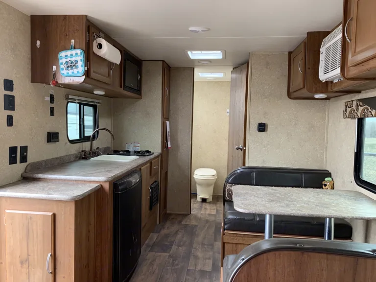 Our Rocky Mountain Edition camper is perfect for your next adventure. Complete with heat, a/c, stove top, microwave, refrigerator, and more. It sleeps a family of 4 perfectly and the dinette converts to another bed if needed. The lighted awning serves as a covered patio for your outdoor living space.