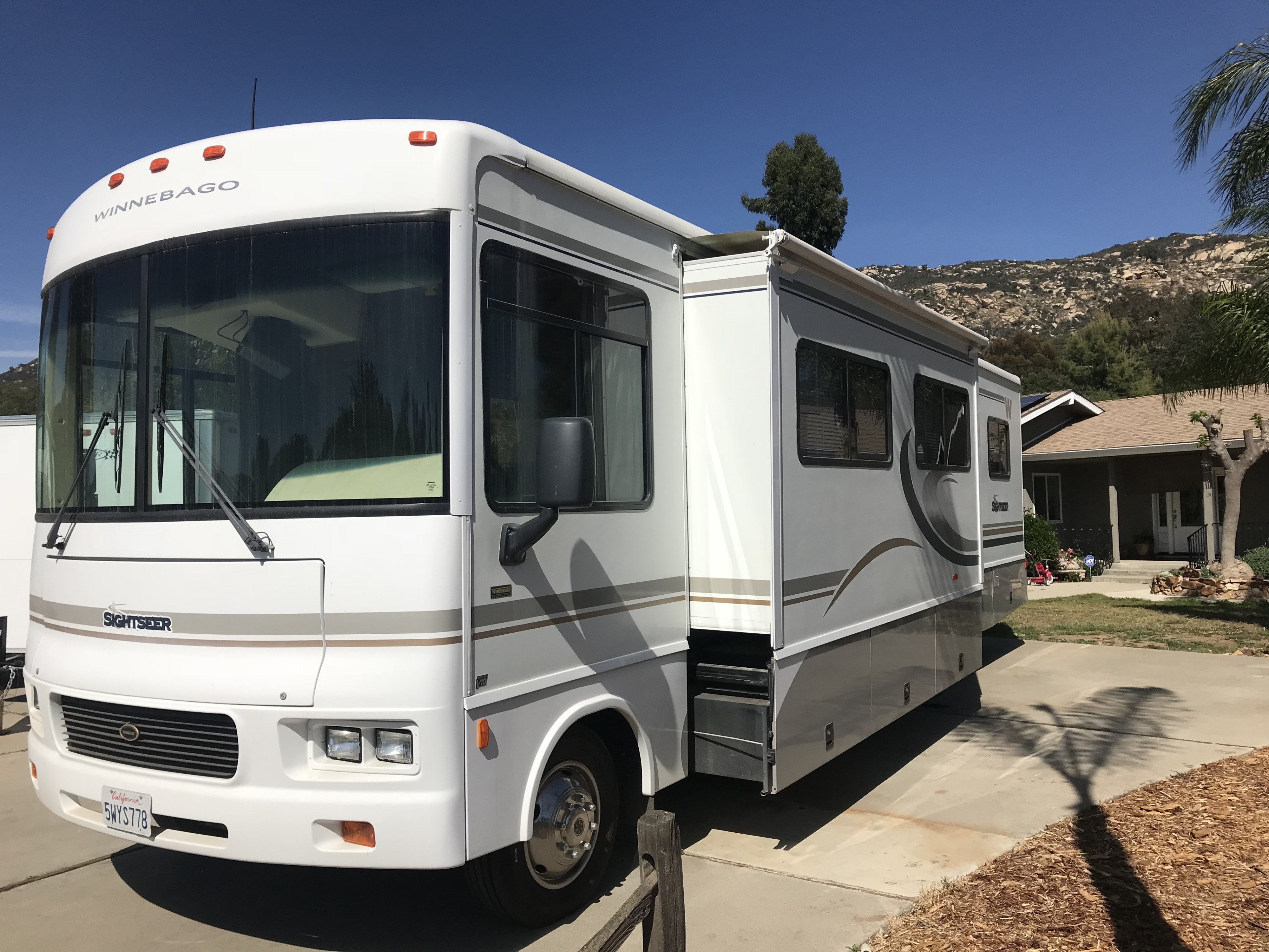 2004 Winnebago Sightseer 34'. We have owned this motorhome for two years now and it is in great condition, hardly ever used with only 18,500 miles! Very clean inside and out. This coach has two big pop-outs, one that runs full length of the living room, which makes for plenty of room to hang out and room for kids to play. The 2nd pop-out runs length of master bedroom and closet, this makes for plenty of room to get around the back queen bed and access all the dresser doors and closet. The coach has a queen in the back, the couch folds out to a bed, and the dining table folds down to a bed (mainly for a small child my 8yr old has slept on it). Has a generator that will run both air conditioners, one in master bedroom and one in living room, which keeps the coach nice and cool. Comes with all basic necessities, fridge, freezer, stove, microwave, and sink. Outside has a handheld shower, stereo, and a TON of under compartment cabinets for all the camping needs. We mainly use this coach for dry camping so water storage is a must for us, this has a 72 gallon fresh water storage, 14 Gal propane, and 75 gallons of fuel for the coach.