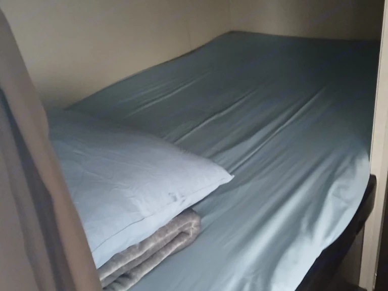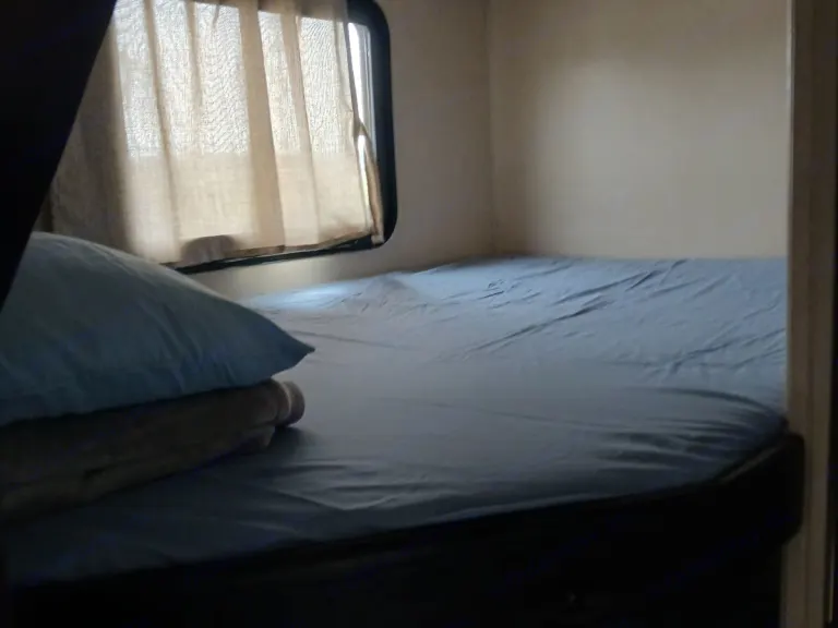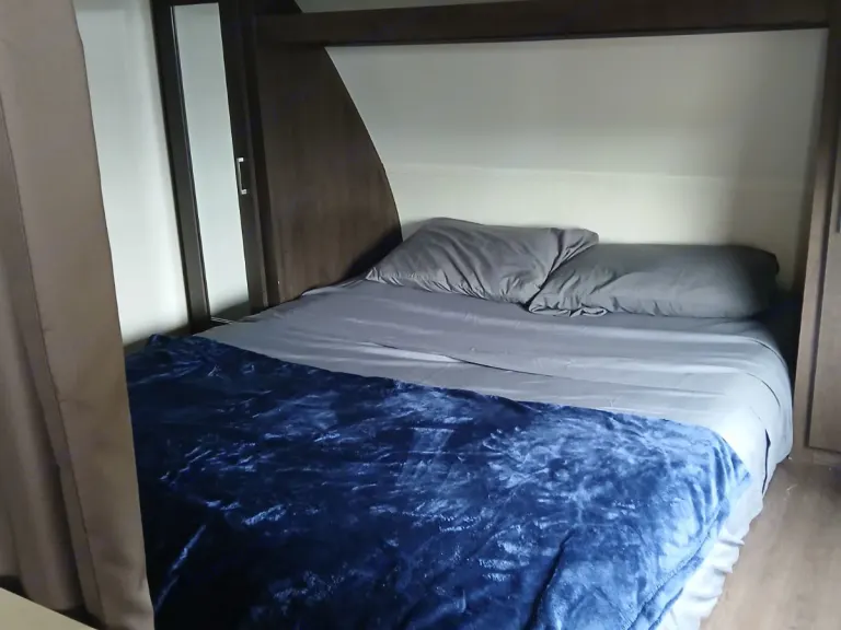 Inside an RV rental: a compact sleeping area featuring a bed with gray sheets, a plush blue blanket, and a fun skeleton toy on a shelf.. Xlite 261BHXL 2019
