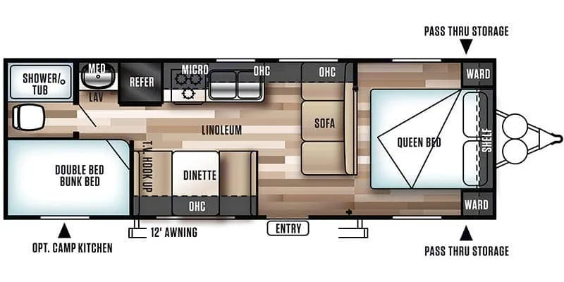 The 261Bhxl offers a smart, open layout ideal for weekend getaways or extended camping trips. The private front queen bedroom provides parents with their own retreat, while the rear double bunk beds are great for kids or guests.The fully equipped kitchen makes meal prep simple with a stove, oven, microwave, and refrigerator. A full bathroom with shower adds convenience, and ample storage throughout ensures you have space for all your gear. Lightweight and easy to tow, this bunkhouse is a great option for families looking for comfort without the size of a larger trailer.What's included• Amenities: