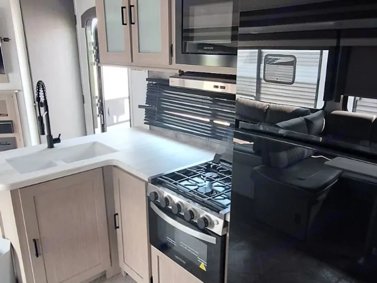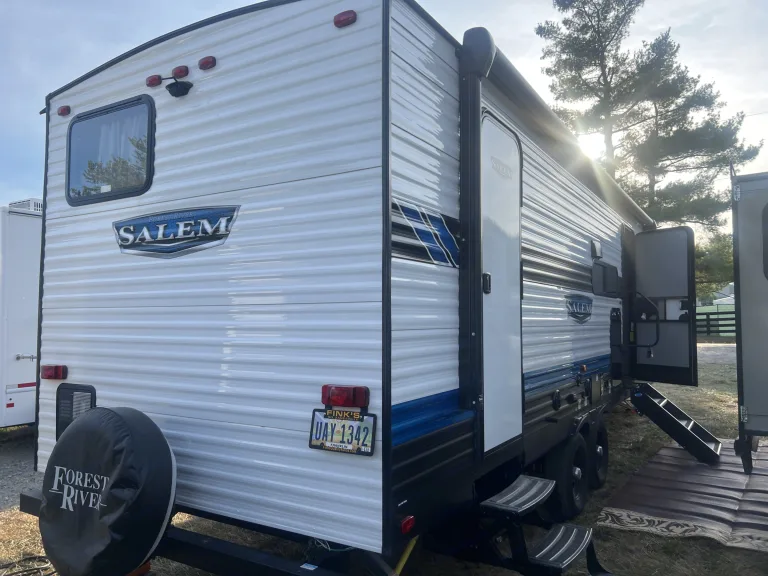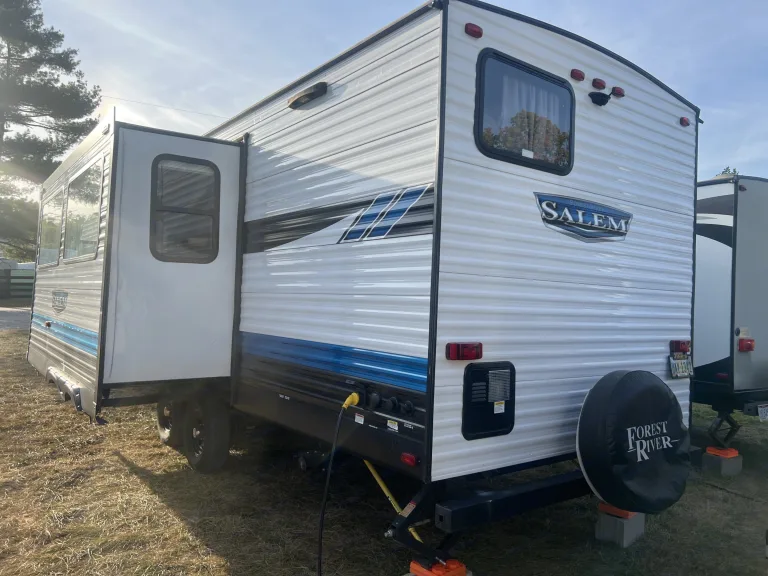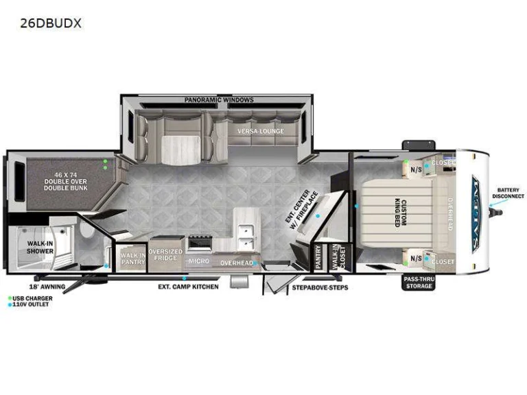 The 2023 Salem 26Dbud offers a modern layout with family-focused comfort and upgraded features. Designed for easy living, this bunkhouse model provides spacious sleeping arrangements and a bright, open interior.The private front master bedroom includes a queen bed with overhead storage. In the rear, double-over-double bunk beds offer generous sleeping space for kids or guests. The large slide-out expands the main living area, giving you room to relax, dine, and unwind comfortably.The fully equipped kitchen features a refrigerator, stove, oven, microwave, and ample cabinet storage. A full bathroom with shower and toilet provides convenience on the road. Climate control with A/C and heat ensures year-round comfort.