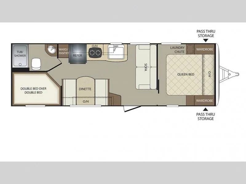 If you are looking for double size bunk beds, a front private bedroom, plus a sofa in the living room in your next travel trailer then this is the travel trailer for you.As you enter straight ahead there is a sofa facing the kitchen and dining area, plus the kitchen amenities are along the road side wall. There is a sink, two burner range, refrigerator, and awardrobe/pantry. On the opposite side the booth dinette provides an area for eating meals, playing games, and an additional sleeping space at night. There is plenty of storage in the overhead cabinets above the dinette and the kitchen area.In the rear right corner there is a bath including a tub/shower, toilet, and corner sink with storage above. Next to the bath is a set of double size bunk beds for the kids or guests.The front private bedroom features a queen bed, dual wardrobes, a laundry chute, plus a space savings sliding door.If you are looking for more space to stow your outdoor gear, the exterior pass thru storage compartment will come in handy.