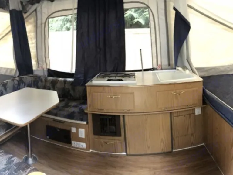 We have a great, lightweight (under 1600lbs) pop up camper trailer. It sleeps about 6 people. It’s a 2003 Flaggstaff camper, great, compact with a nice layout for family.