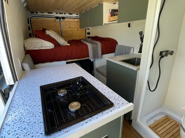 Enjoy the beautiful PNW with our van Fanny! Travel to the gorgeous Hoh rainforest, or head up into the stunning Cascade Mountains. Longer trip in mind? Head down the California coast, the Rocky Mountains or into Canada. Fanny is the perfect adventure partner for all your dream road-trips. She is custom-built with love and detail by us Kait and Avery. This isn’t a cookie cutter build so you can travel in style! Here are some of the things she comes with:- Wool-insulated walls and an electric heater