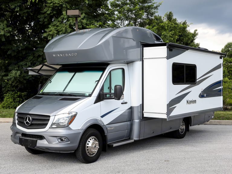 The Winnebago® Navion® is proof that good things come in powerful, efficient packages. Built on the proven Mercedes-Benz® Sprinter chassis, this is the Navion 24D which has one large slide out to expand your living space with the touch of a button. A full galley makes meal prep a pleasure, while swivel cab seats provide added seating options in the lounge and dining area. Follow your own road without sacrificing the finer things in life, in the Winnebago Navion.From casual dining to gourmet feasts, the Navion’s well-equipped galley makes cooking a pleasure. The two burner range and the touch-control microwave/convection oven handle cooking and baking duties, while the double-door compressor refrigerator/freezer keeps things cool — without tapping into your propane supply.A variety of innovative sleeping options are available with the Navion. The 24D features a walkaround queen Murphy+ Bed that folds up out of the way when not in use. A cabover bunk is available to boost sleeping capacity as well as a convertible booth dinette. This unit also features a private bath with separate shower, flexible showerhead and retractable self-cleaning shower screen.Up front, the Navion cab puts you in complete command. Seats are fully adjustable, with lumbar, recline, swivel and slide functions. Information and entertainment are at your fingertips, thanks to the 9" touch screen Infotainment Center with Rand McNally RV GPS. When your day’s work is complete, draw the sliding, pleated windshield blinds to help create a restful night.Off-the-grid power is supplied by two 100-watt solar panels and the 3,600-watt Cummins Onan MicroQuiet LP generator. And the powered patio awning with LED lights, plus the exterior speakers, let you make yourself comfortable and fully at home in camp. When parked at the campsite, this coach is powered by a 30 AMP connection.Book your dates today!