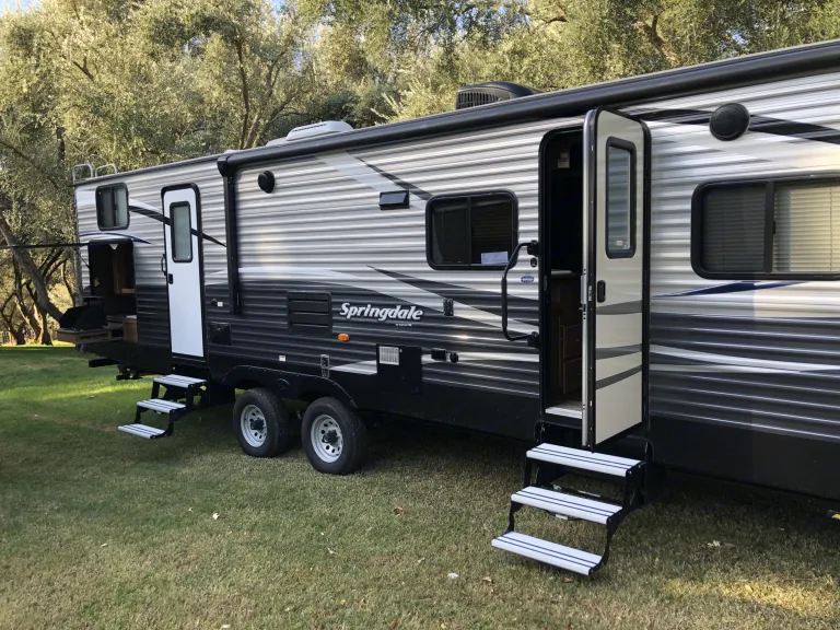 2017 Keystone Springdale Bunkhouse- perfect for family trips! There is a private front bedroom with a queen bed, a slide out u-shaped dinette for eating meals that folds down for an added sleeping space, and a large bunkhouse Room in the back. This trailer can sleep 8-10.Featured outside the trailer is an adjustable large awning, an outdoor kitchen (refrigerator, sink, propane cooktop), and an outdoor shower.If you're interested in dry camping, this trailer has a large capacity 52 gallon fresh water tank, two grey water tanks totaling 78 gals, and a 38 gallon black water tank. Combined with a generator (available for rent from us, required to run the air conditioner and any other AC electric components) you can enjoy dry camping for quite some time.Delivery is available for a fee if you don't have a tow vehicle capable of towing this trailer.Pick up/drop off times are flexible, just let me know what you prefer and we can make it work